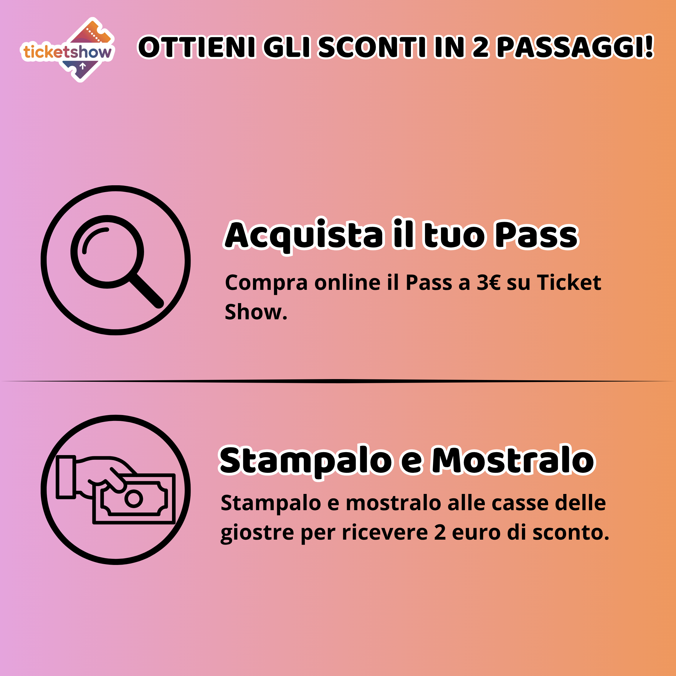 Acquistando il tuo pass online riceverai un coupon personale con il tuo nome e un codice univoco. Ti basterà stampare il coupon 🖨️ e mostrarlo alle casse delle giostre 🎟️ per ottenere subito lo sconto.